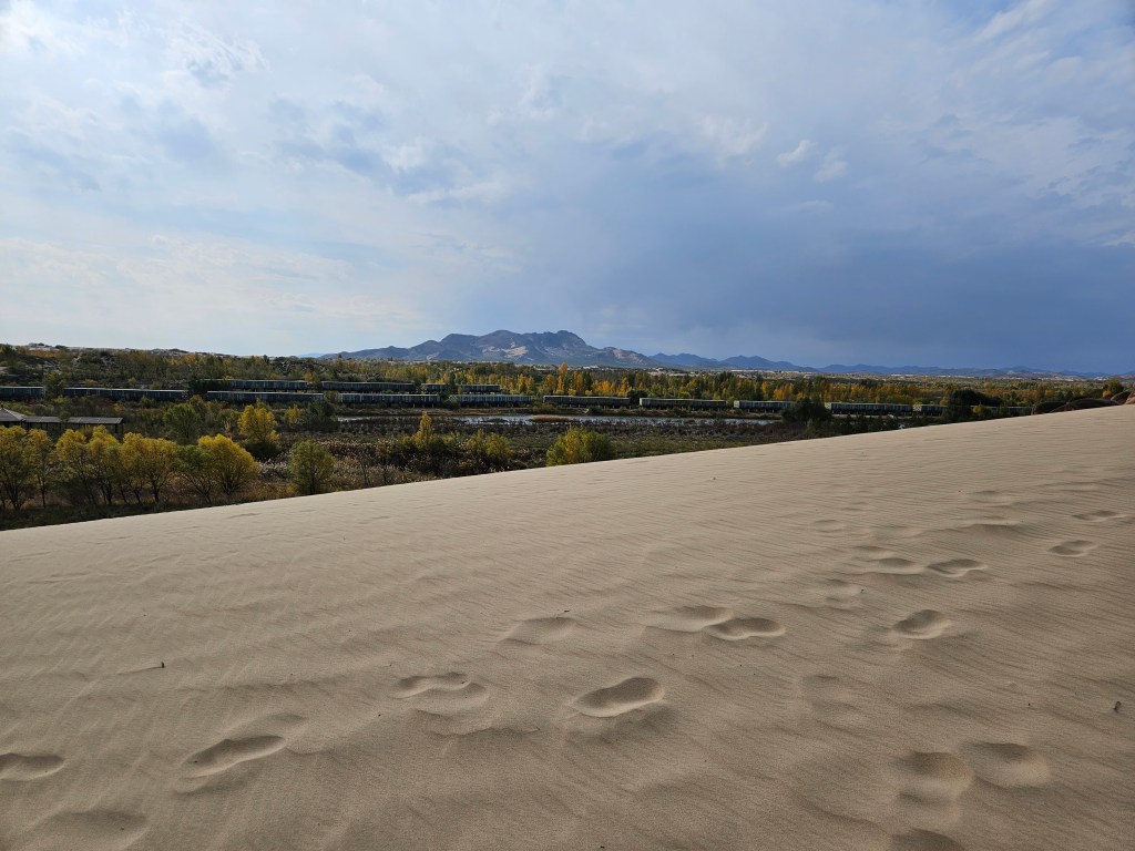 Adverse to bumpy ride, we opted for a slow walk up hill on the sand dunes. Took a little longer than expected, and sweating even in the breezy autumn wind. Upon going up the hill, the reward will be the beautiful view of the nearby autumn views. With the side lake to boot too. Getting to Yulongsha will require private transfer, as there are no public transportation. However, there are other interesting smaller scenic stops and small cities which will be easy stops for private transfer.
