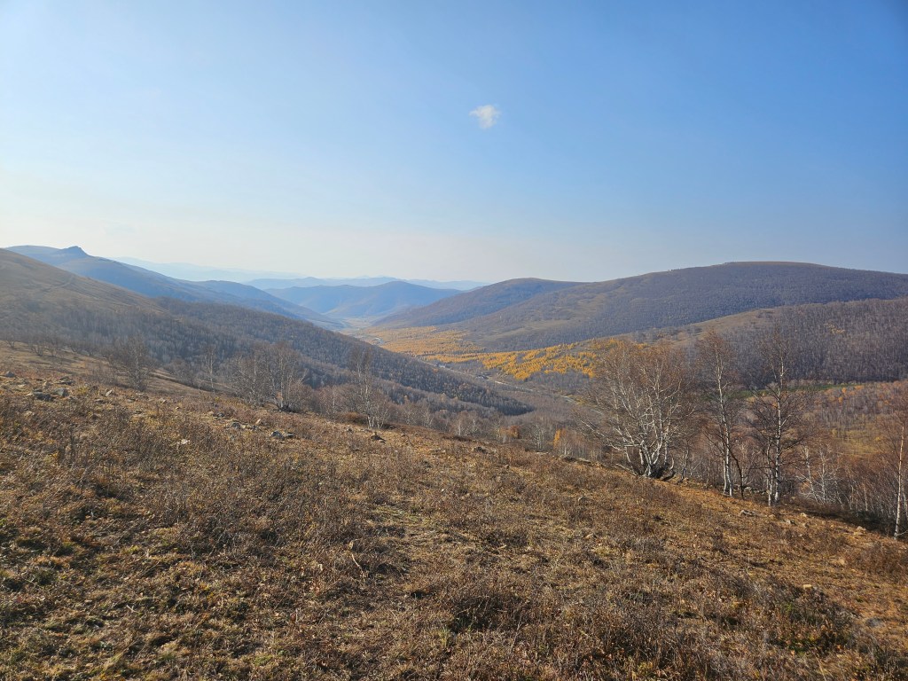 Huang Gang Liang is a man-made route passing by uphill and downhill of beautiful views of Inner Mongolia. The drive is pleasant, not overly small or bumpy or difficult corners. Along the route, there are a few spots for scenic photo-taking. Even in the cold autumn days, men and women are stationed along the routes to remind all to take precaution for forest fire.